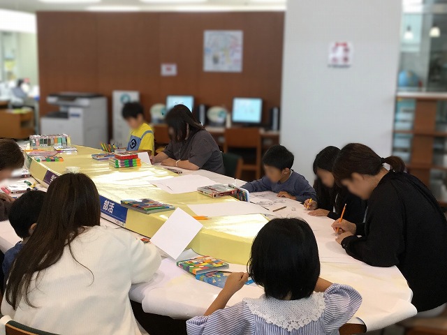 白い紙を配ると、大人も子どもも、すぐに紙に向き合って、絵から描く人、お話から書く人、それぞれにかきはじめて、みんなが自分のえほんをつくることができました。