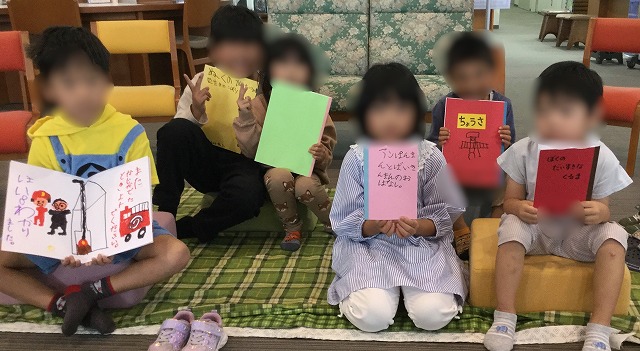 できあがると、「えほんや!」「ほんもののえほんだね」「持って帰っていいの?」という嬉しそうな声がきかれました。世界にたったひとつしかない大切な一冊となりました。