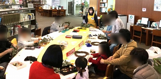 まんのう町で拾ったまつぼっくりやどんぐりなどの木の実、ユーカリの木の枝、クリスマスのオーナメントを自分の好きな位置にフラワーワイヤーでとめていきました。