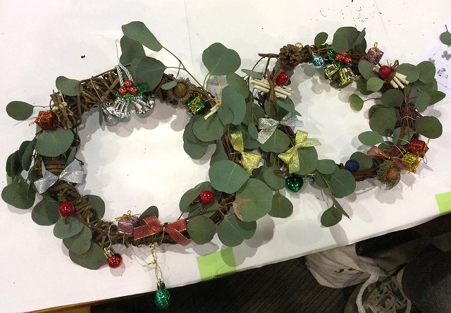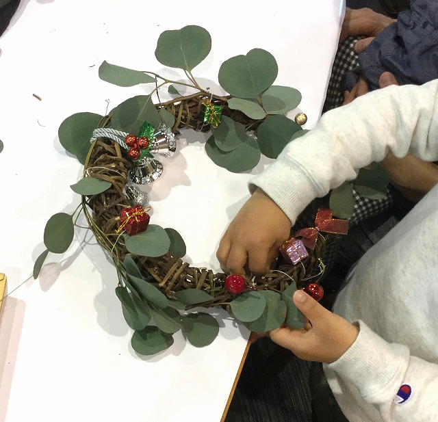 リースは、ひとつずつ大きさが違うので自分の好きな大きさのリースを選んでもらって、クリスマスらしい飾りつけをしました!