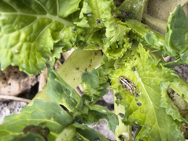 そんなご提案で、アブラムシと暑さ対策のお話を今回はしました。アブラムシはまだ露地ではいないですよねってしゃべったんですけど、講座のあとなんとなく畑のかぶの生長点をほじってみますと普通にいました。気温は低いですが、乾燥してるのがアブラムシにはいいんでしょうね。